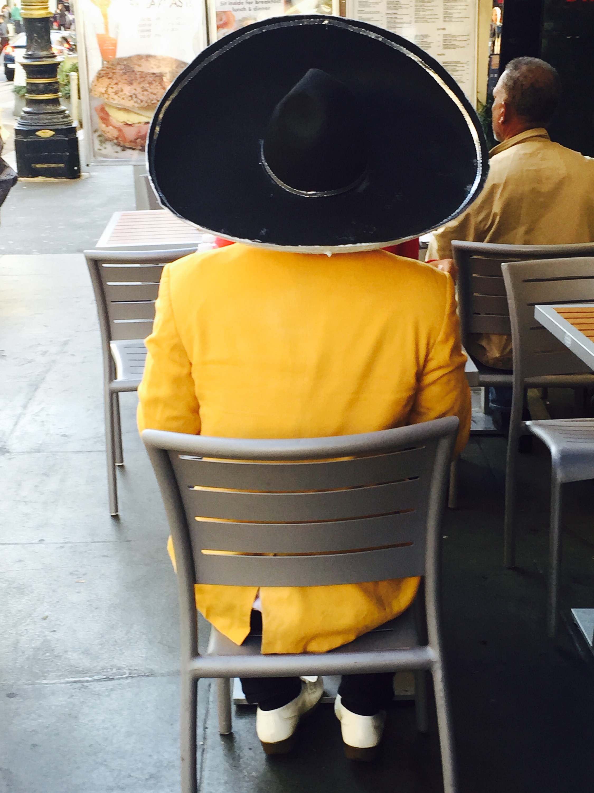They wear their costume early on, and go to coffee shops and restaurants, pretending it is their usual mariachi sombrero cause, after all, they are Mexican and this is California homie!