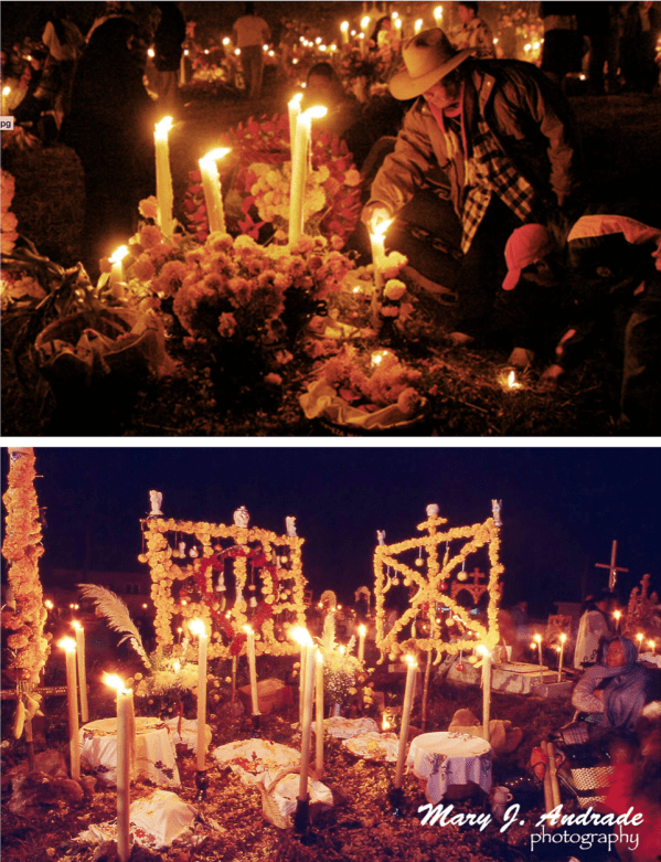 Sin duda las celebraciones más conocidas son las de Michoacán, con arcos de flores de Cempasuchil en las tumbas, velas, y comida, entre muchos otros elementos tanto en el cementerio como en los altares que ponen en sus casas.  Pero Michoacán es un estado, y en cada pueblo tienen su forma de celebrar. “Entre las poblaciones de Michoacán se pueden encontrar diferencias incluso en la forma como sus habitantes hacen los arcos que colocan en los altares y luego llevan al cementerio,” comenta Mary. “Además, está el ritual de la Velación de los Angelitos, único en el área de Pátzcuaro y Zirahuén.”